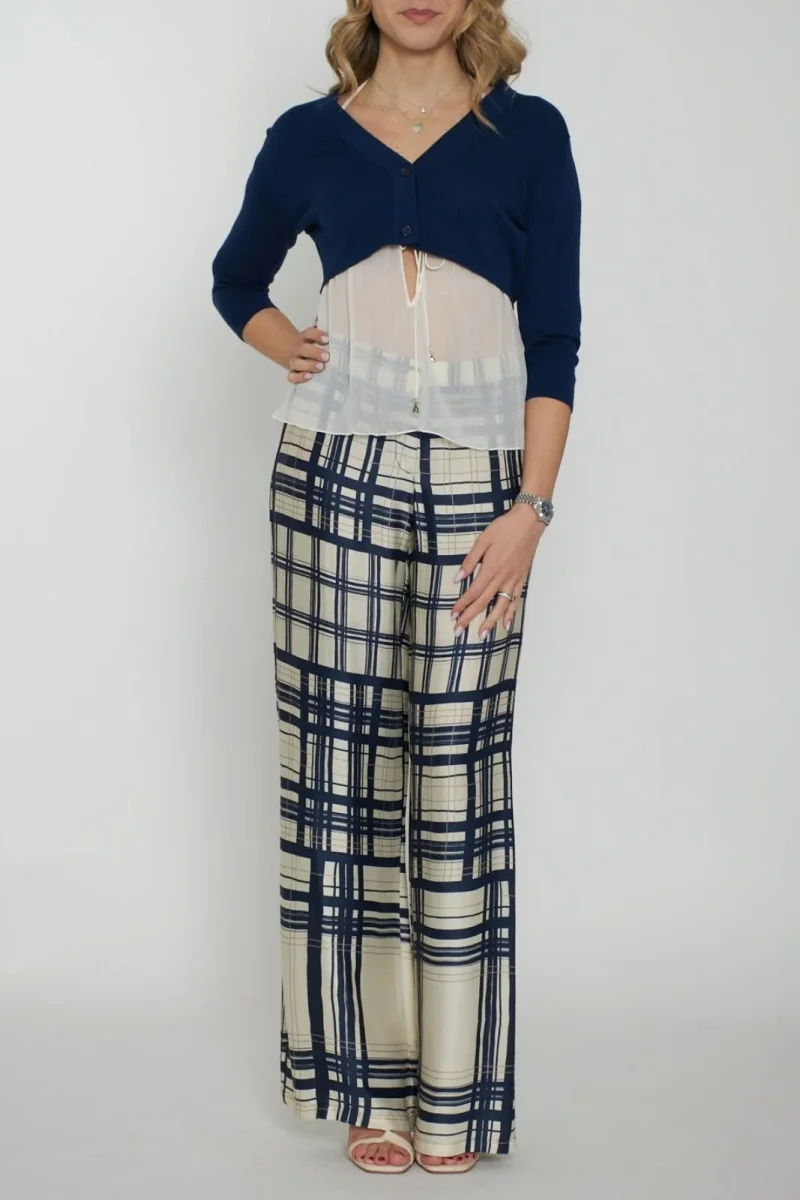 Realizzato in cotone, dal taglio cropped con scollo a V ed allacciatura a due bottoni.