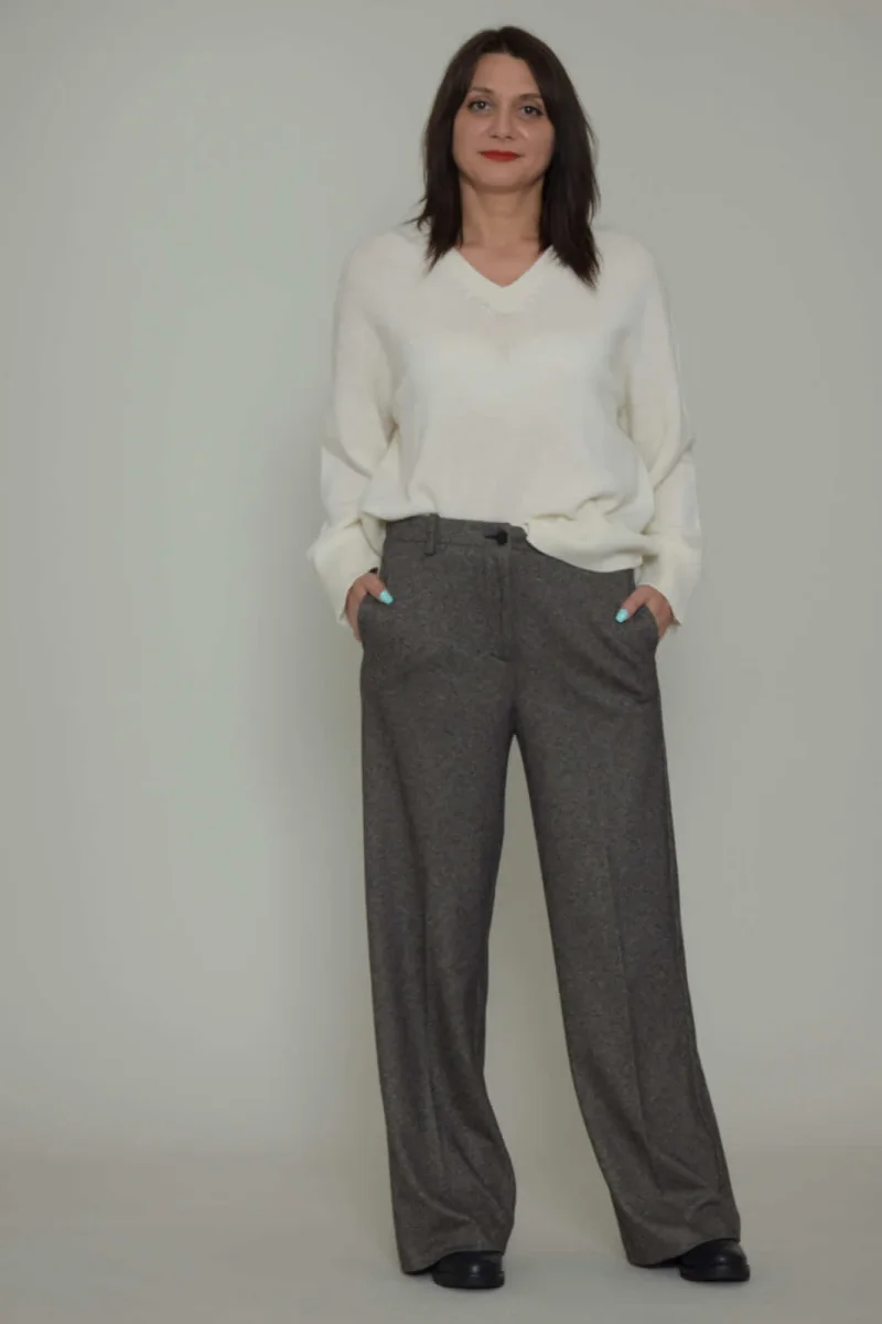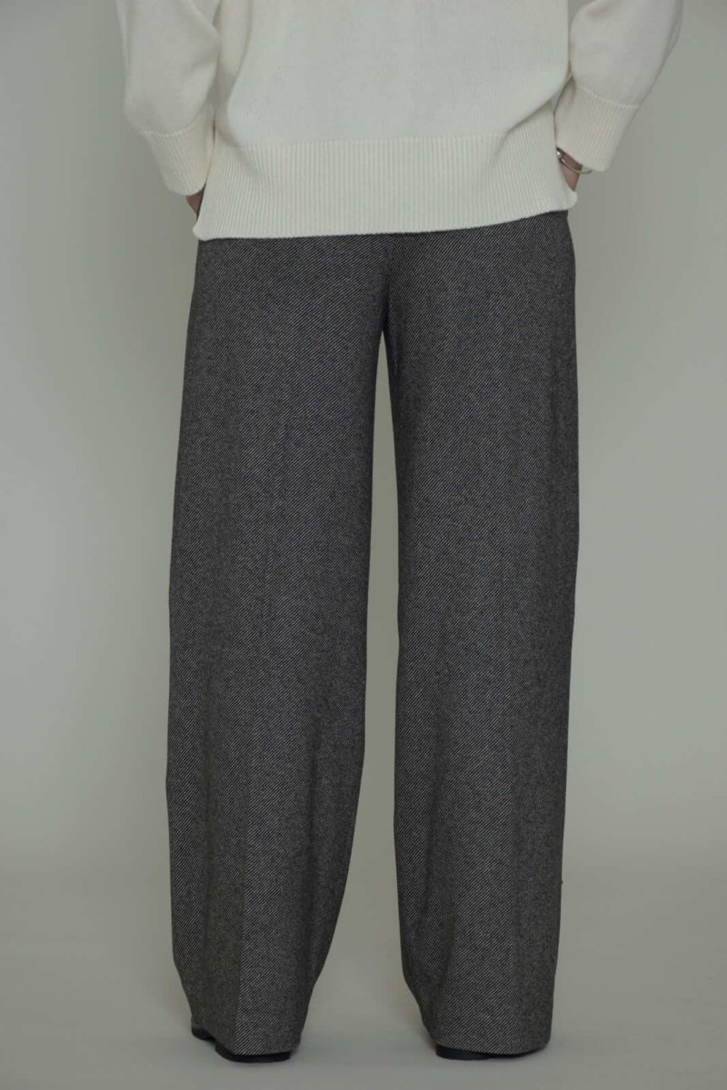 Realizzato in misto viscosa, in lavorazione a trama rigata, con gamba ampia e vita elastica.
